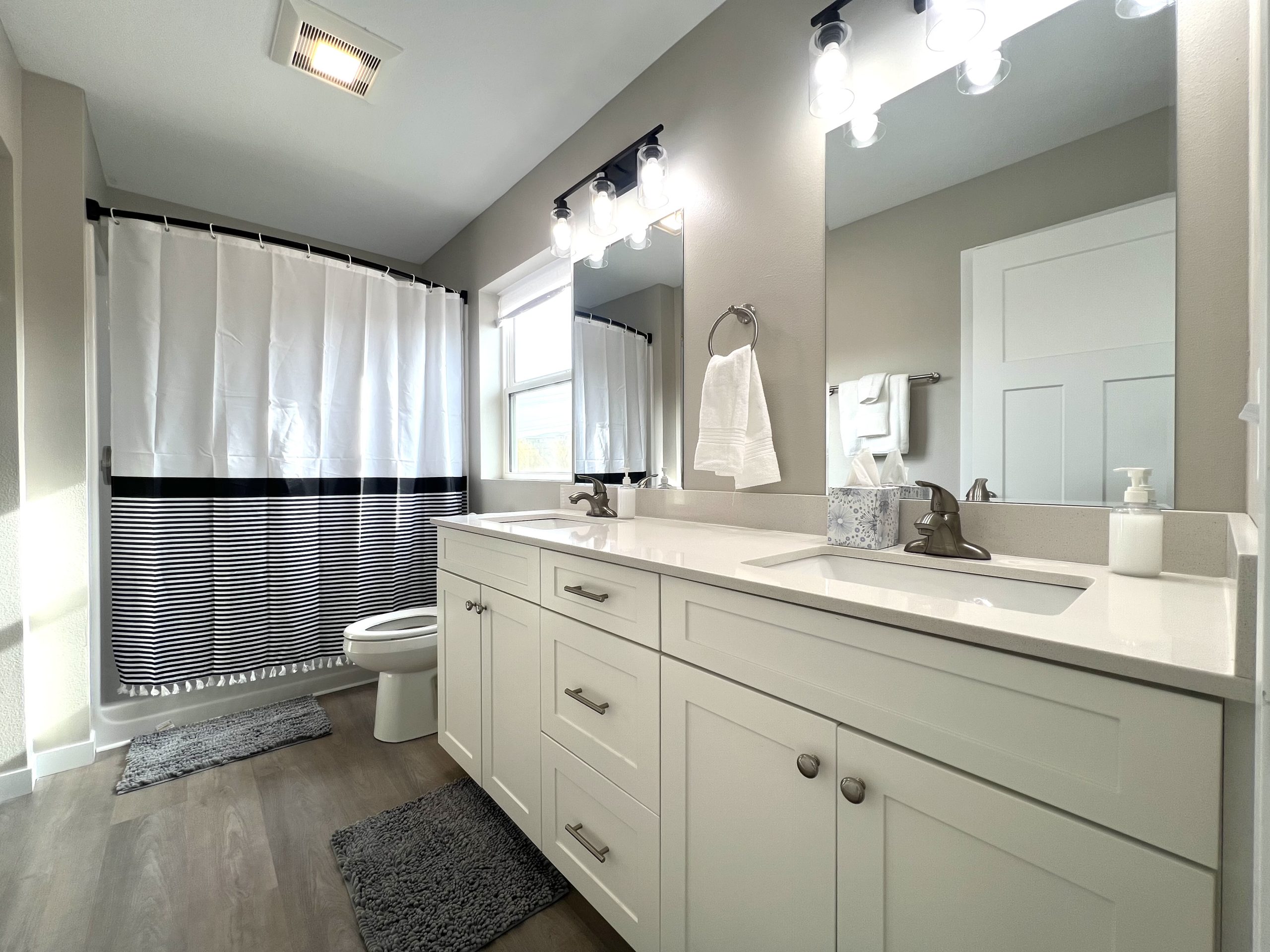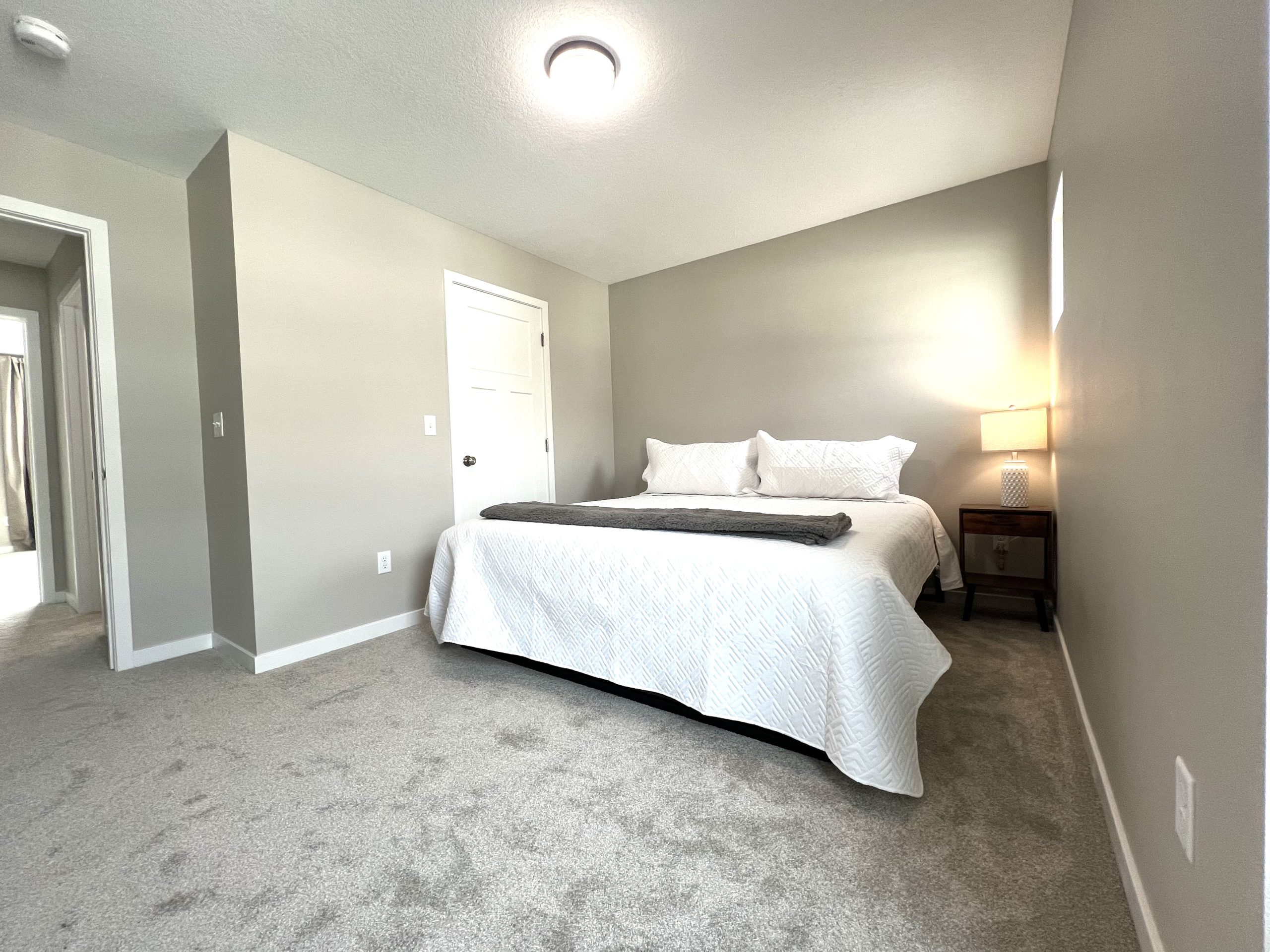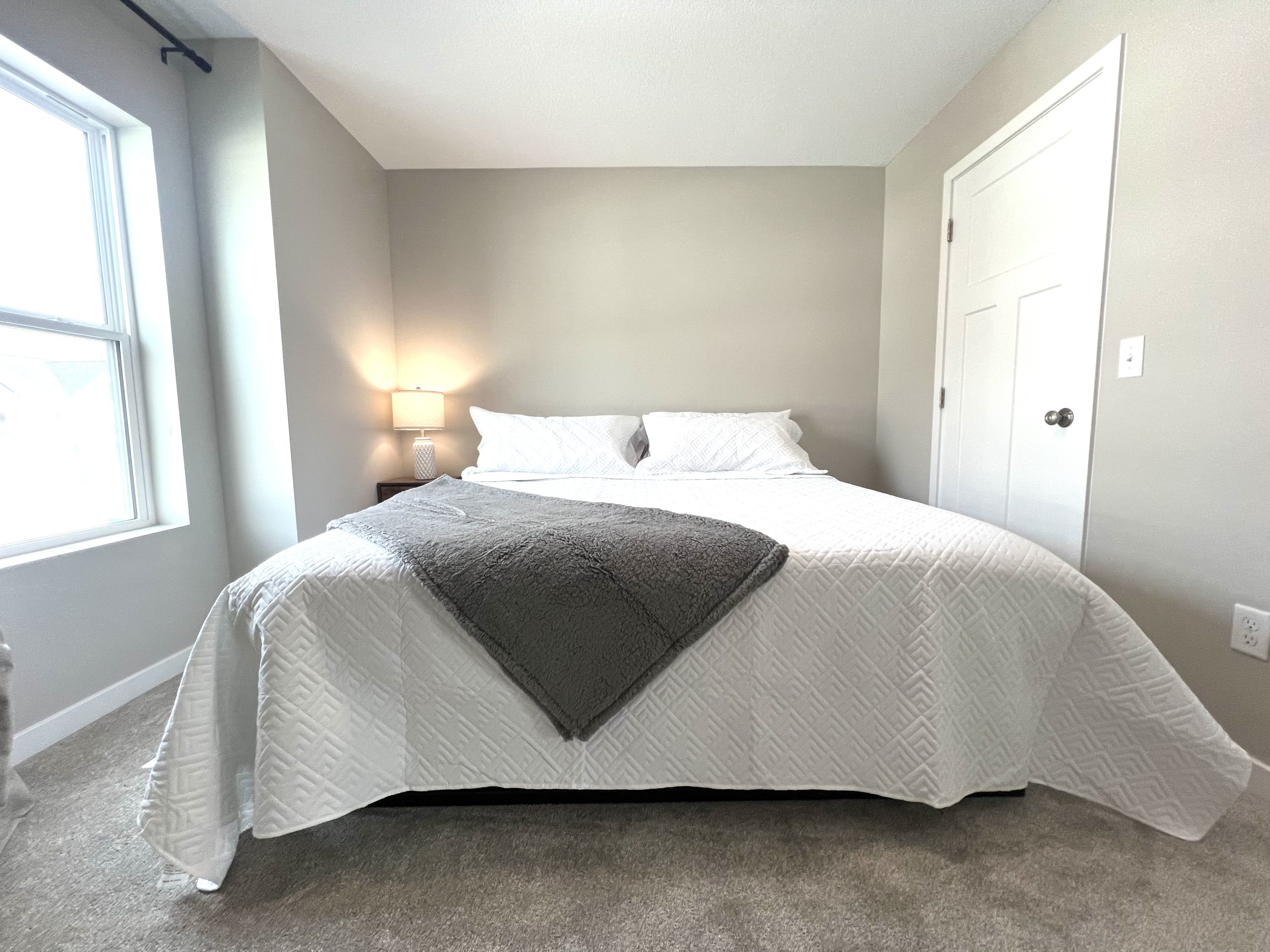 Upstairs you will find 3 large bedrooms, all with large walk-in closets. Laundry facilities are located upstairs on the bedroom level as well. 2 bedrooms offer queen beds. One full bathroom with tub/shower combo. The primary bedroom offers a king bed with a large ensuite bathroom with oversized shower and large walk-in closet.
