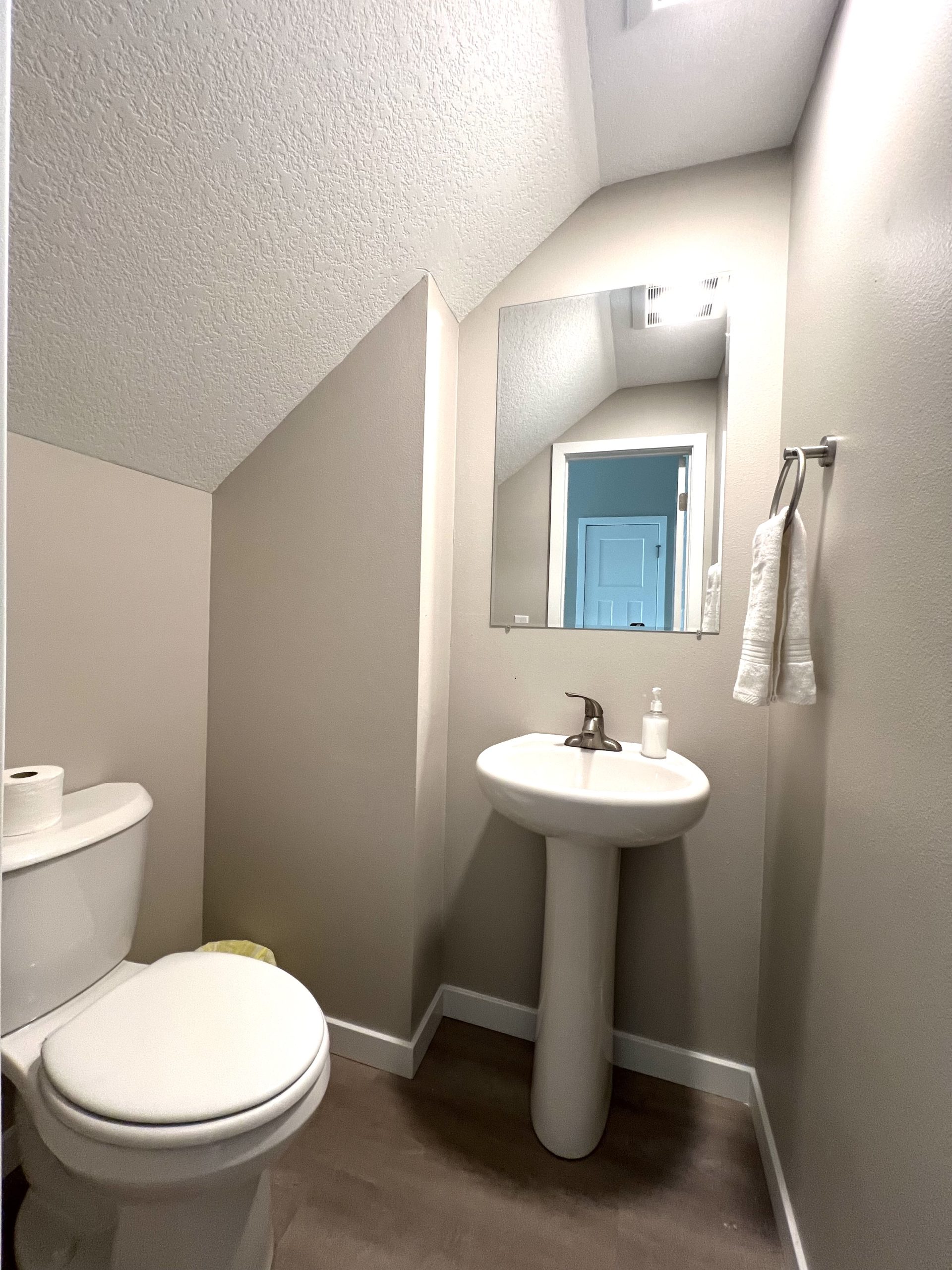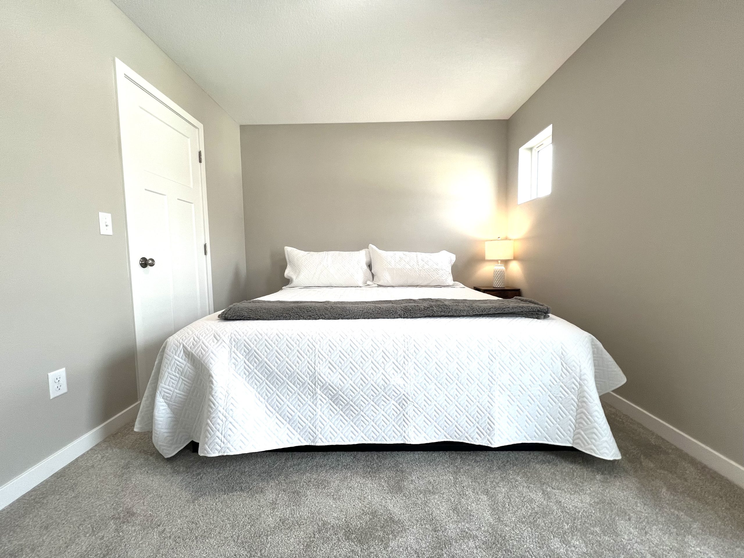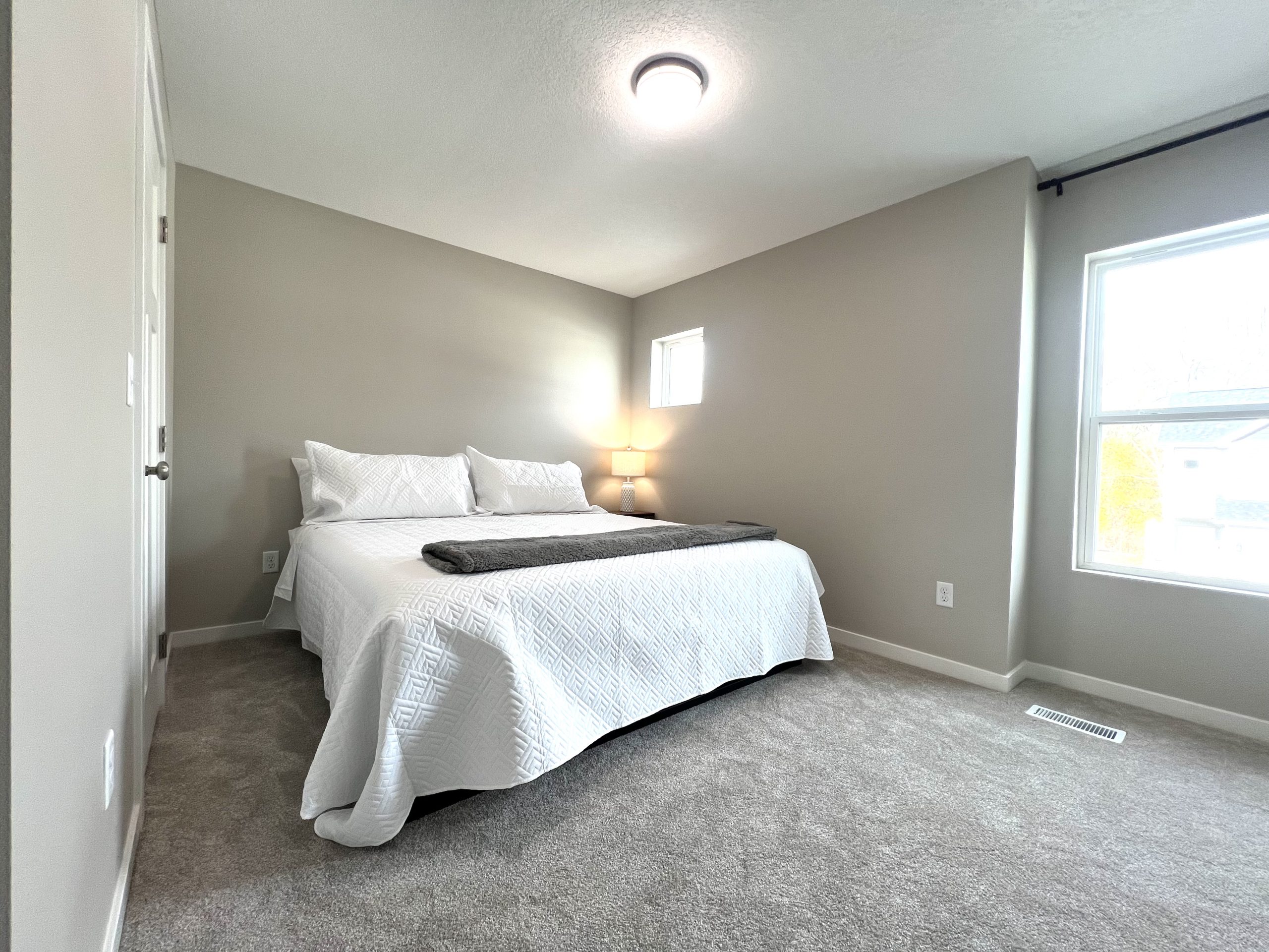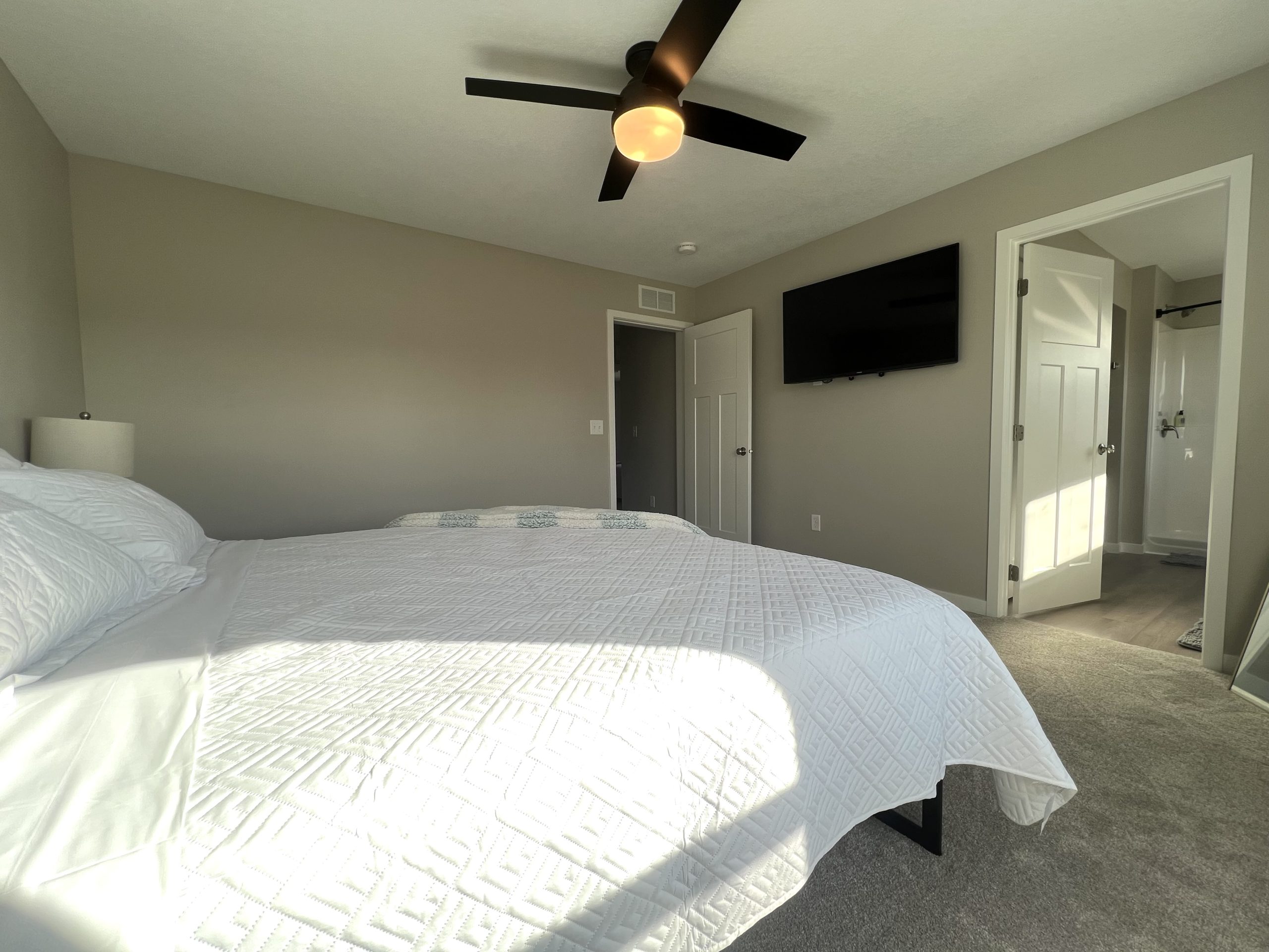 Upstairs you will find 3 large bedrooms, all with large walk-in closets. Laundry facilities are located upstairs on the bedroom level as well. 2 bedrooms offer queen beds. One full bathroom with tub/shower combo. The primary bedroom offers a king bed with a large ensuite bathroom with oversized shower and large walk-in closet.