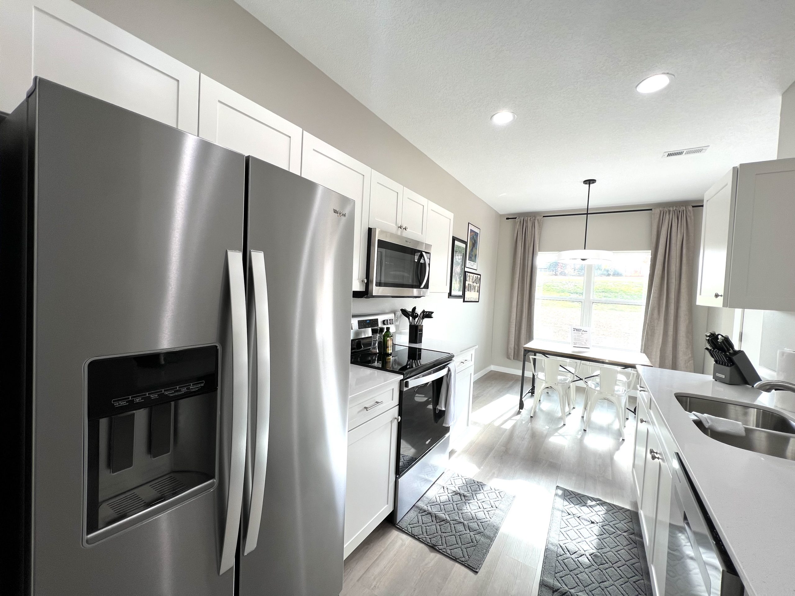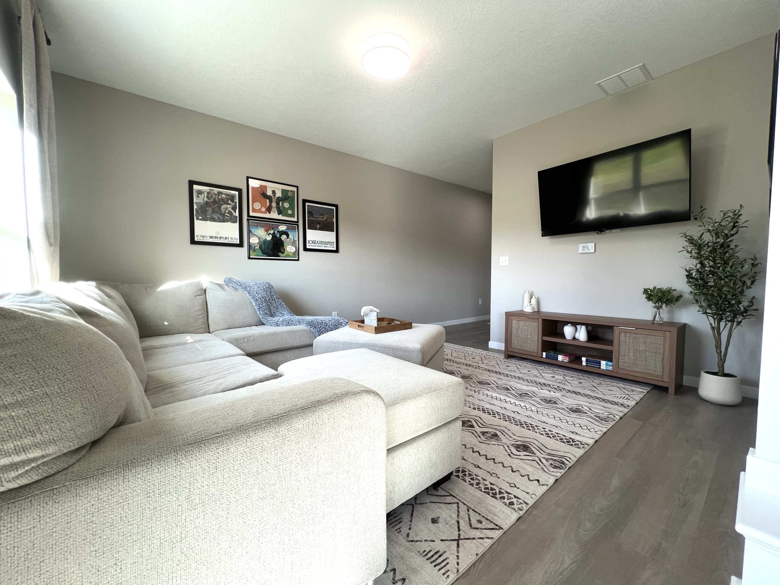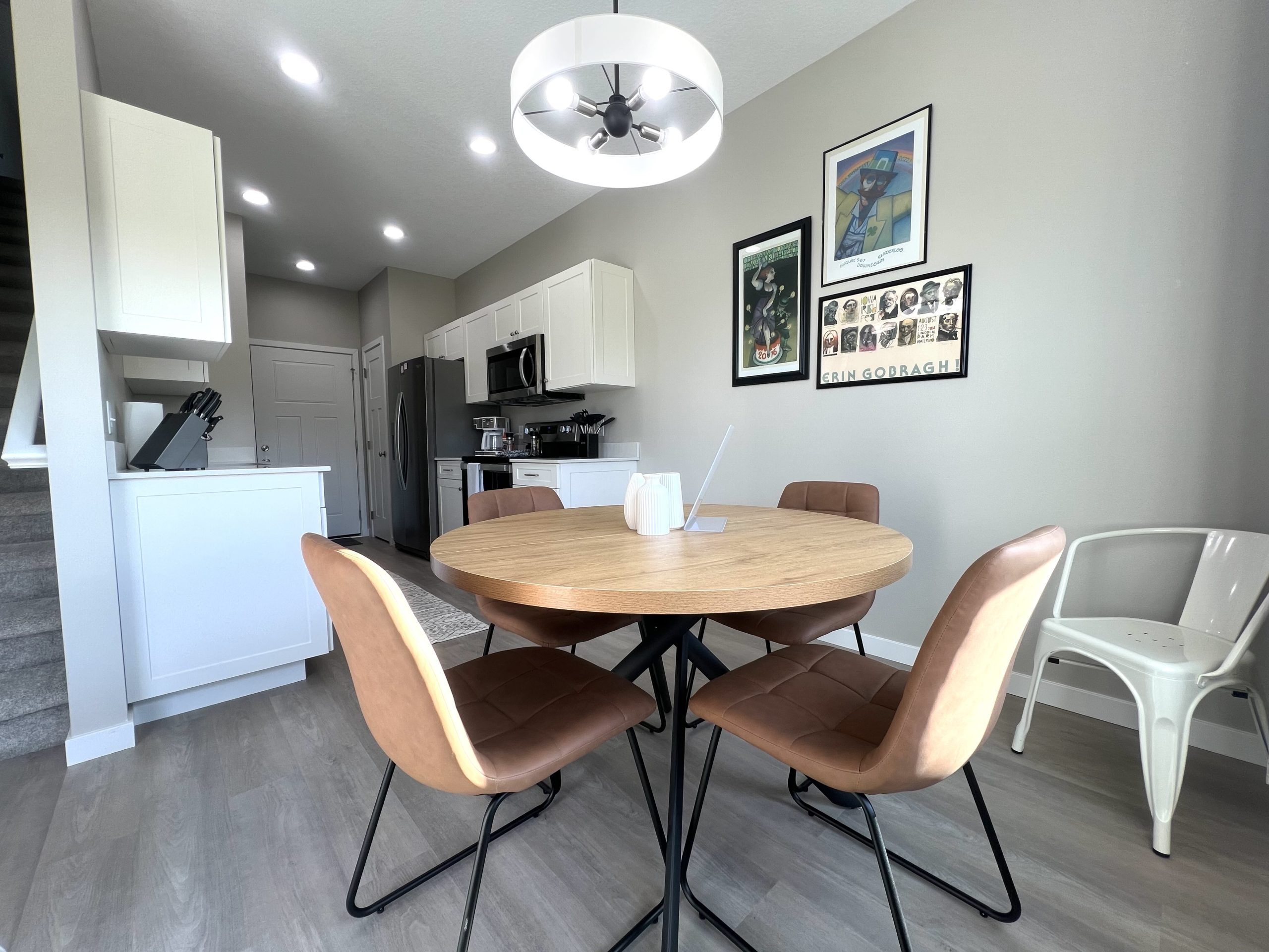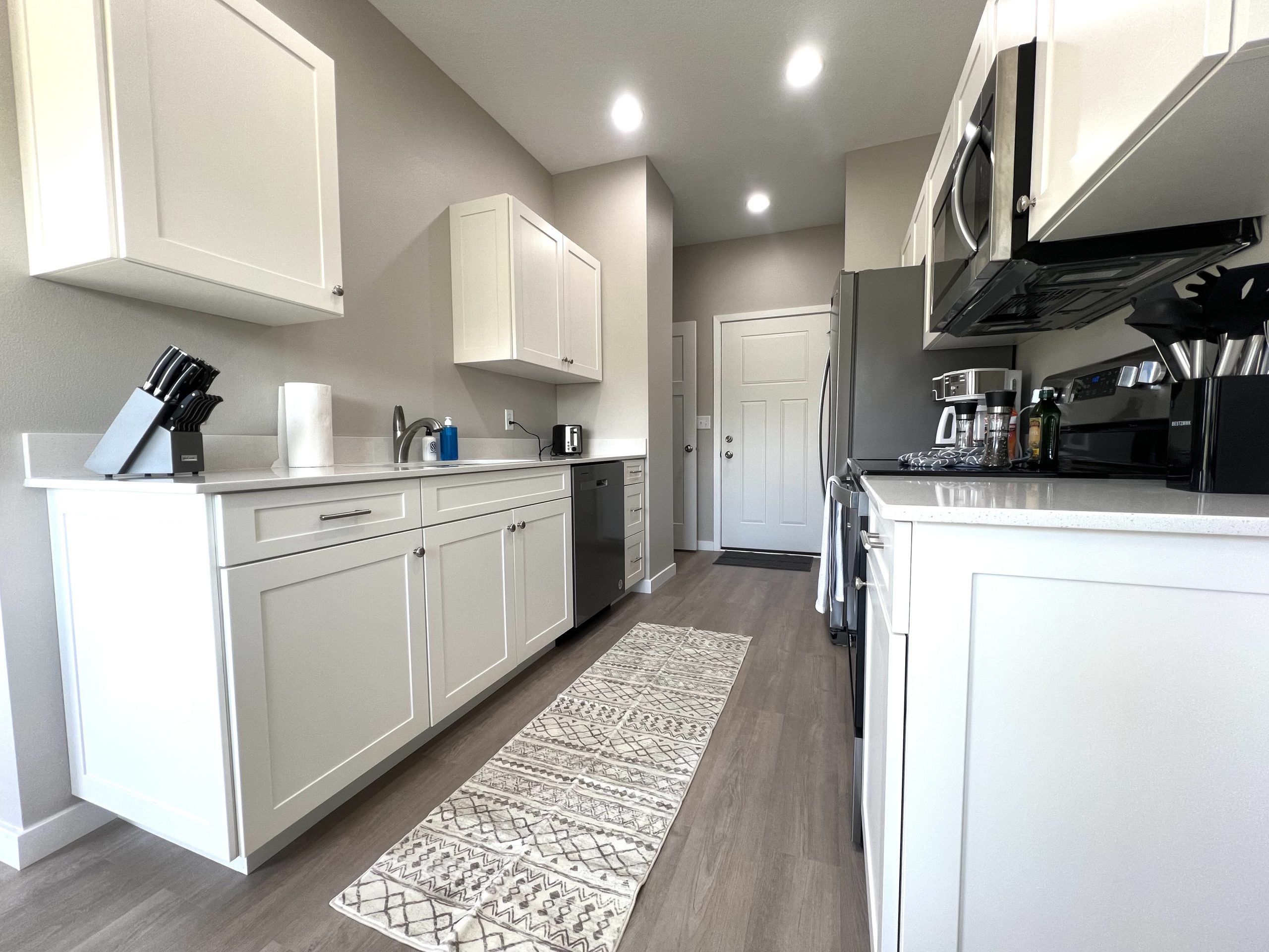 As you walk in the attached two-stall garage you enter into a small mudroom area attached to the modern galley-style kitchen. Beautiful custom cabinets with quartz countertops and new appliances (refrigerator, stove, microwave, dishwasher). The main level of the home continues with a dining area and large living area with enough seating for the entire group!