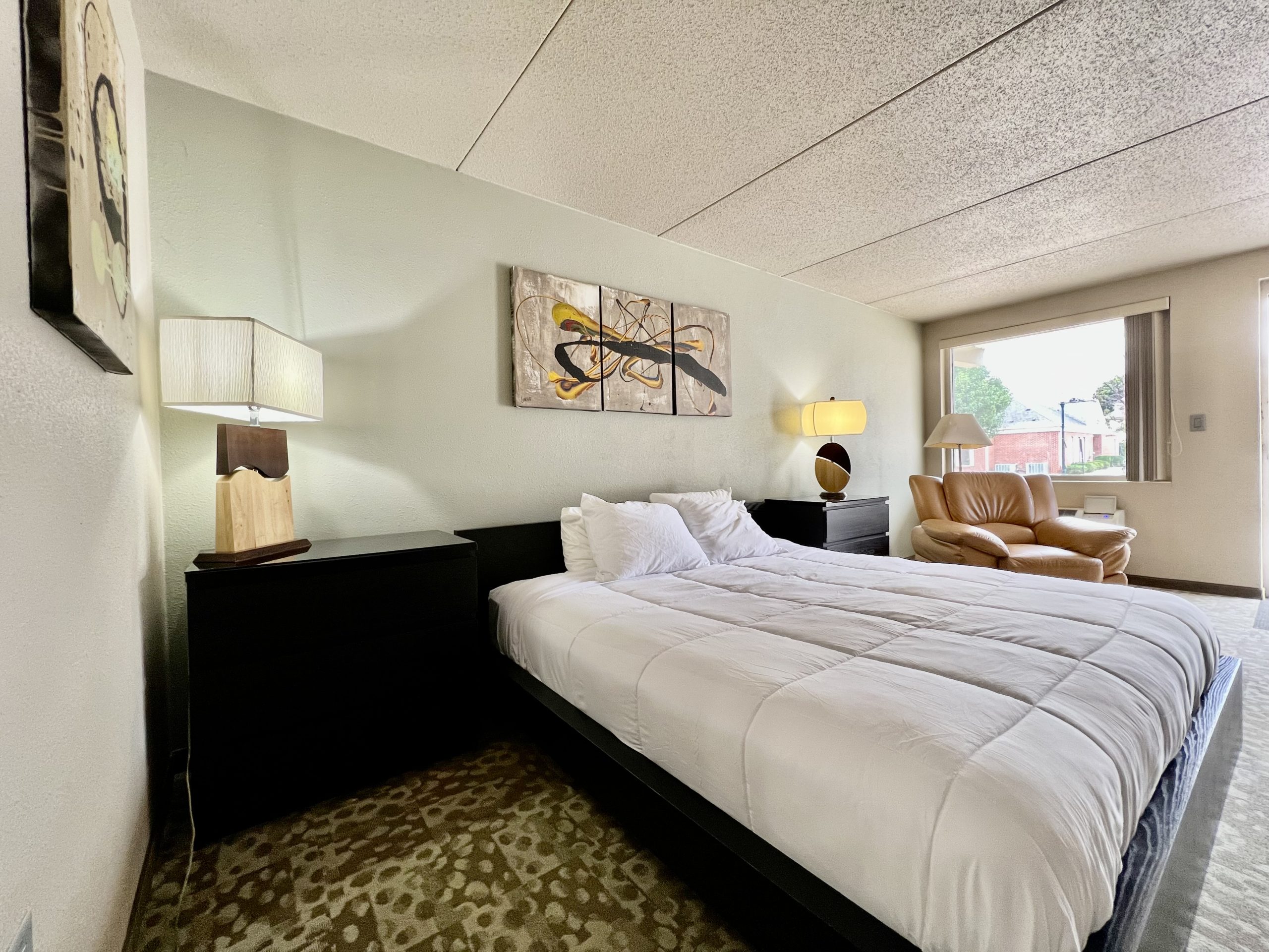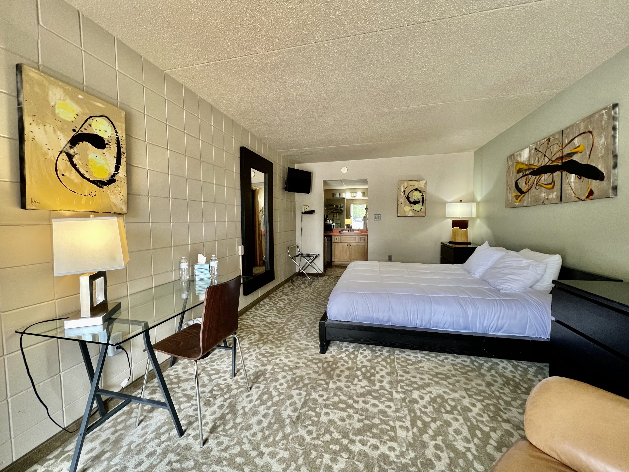 This studio unit measures 300 square feet and offers a king bed, full bathroom, under-counter refrigerator, microwave, smart-TV, and WiFi.