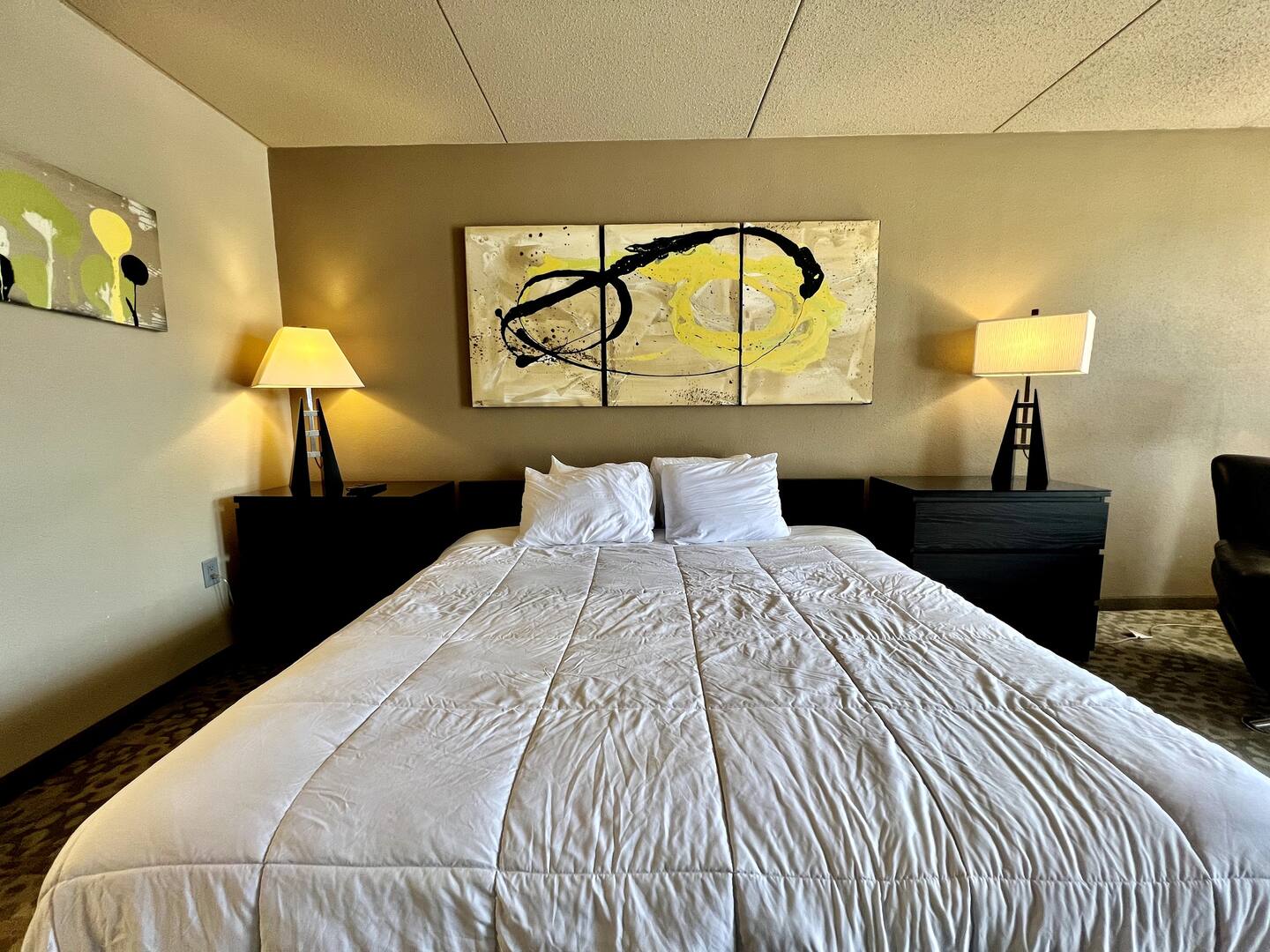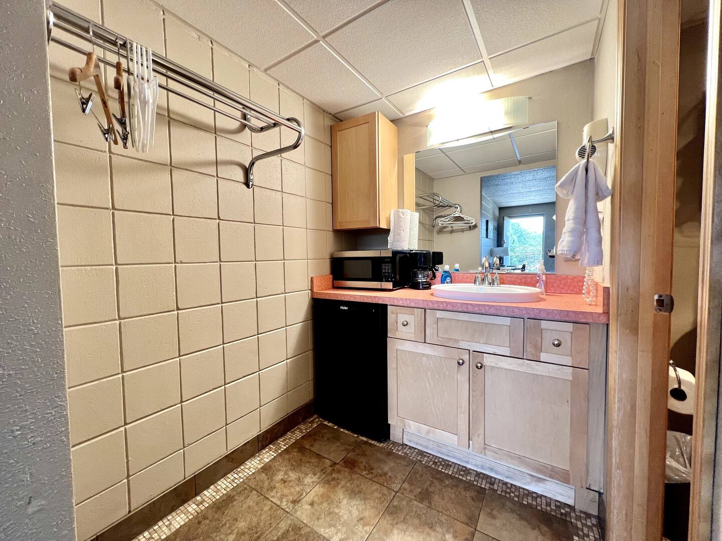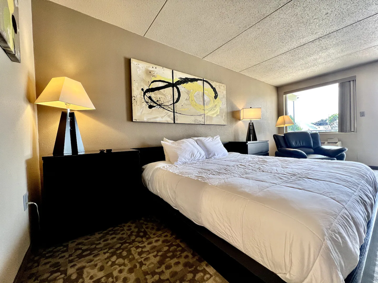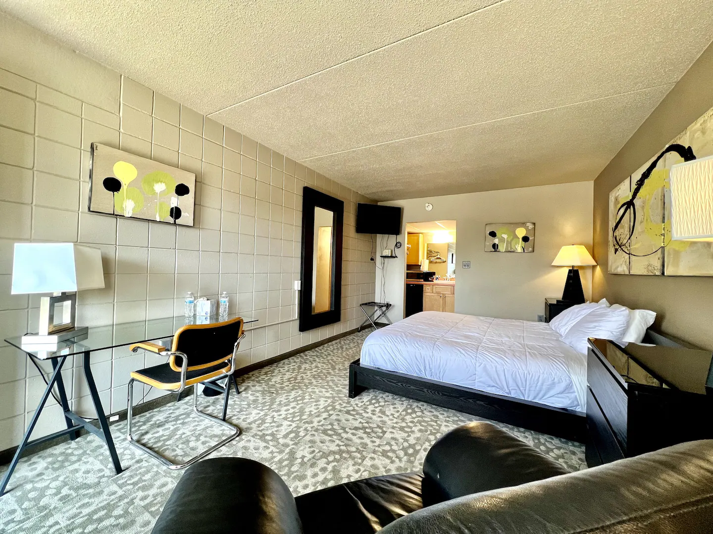 This studio unit measures 300 square feet and offers a king bed, full bathroom, under-counter refrigerator, microwave, smart-TV, and WiFi.