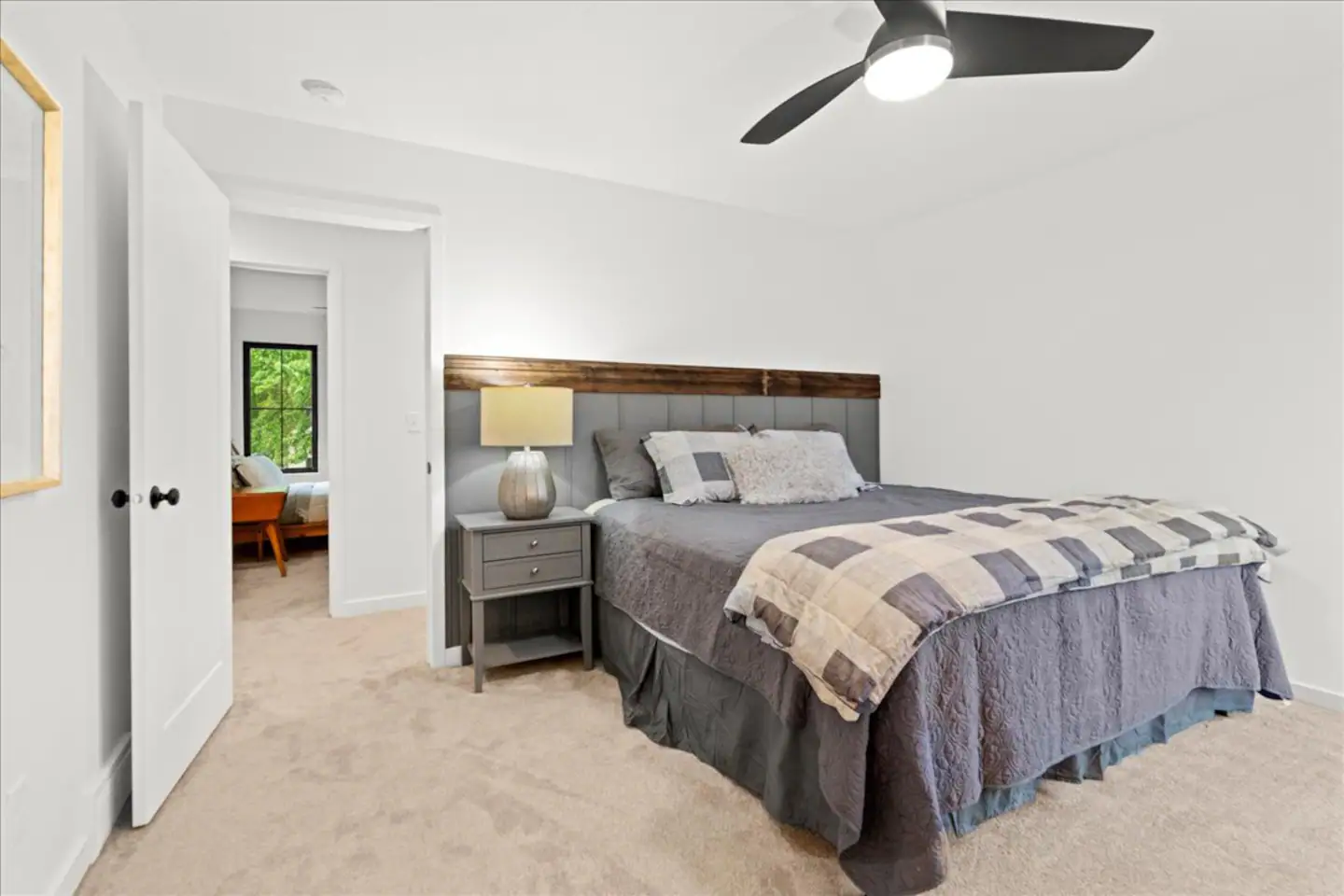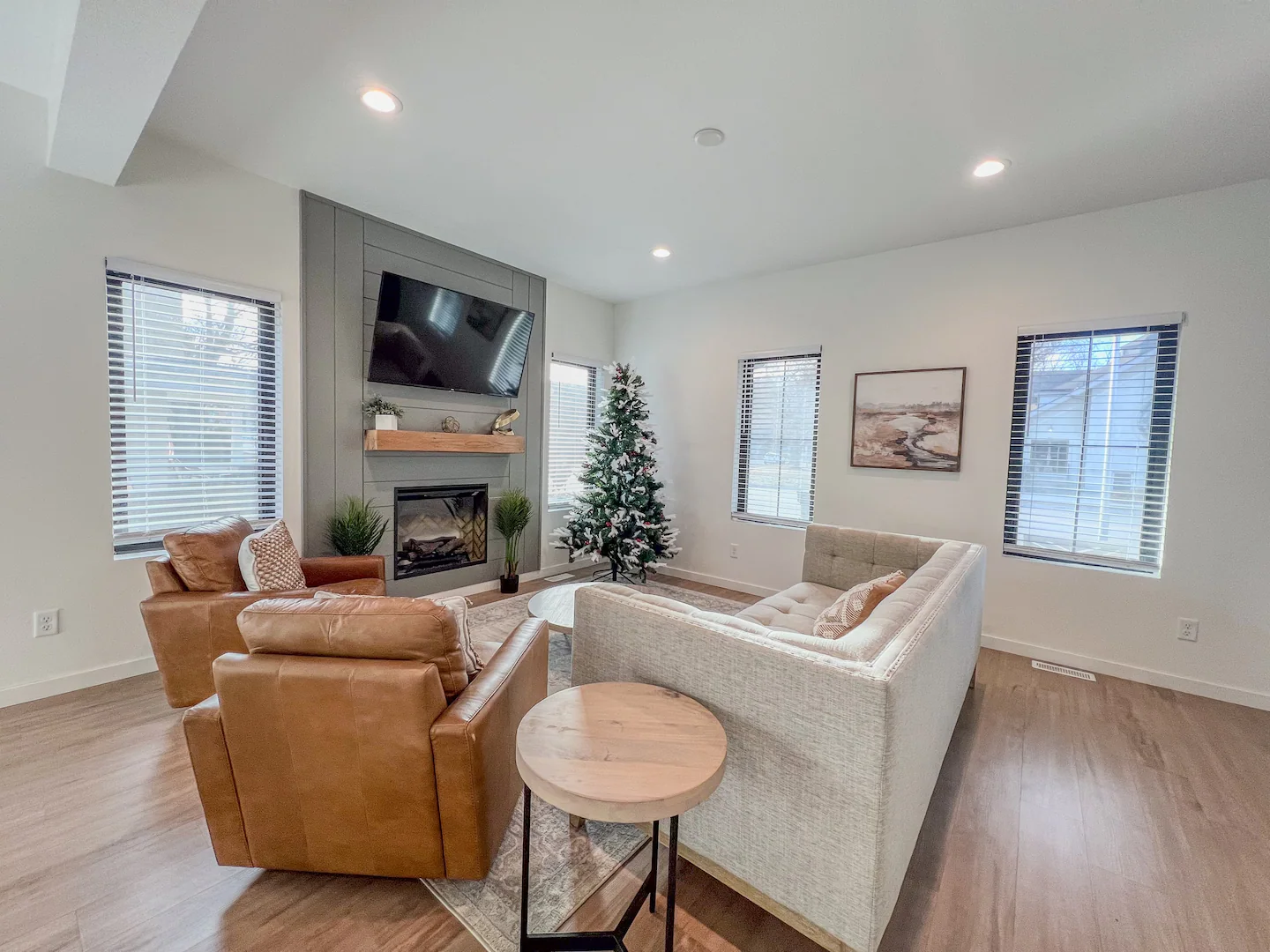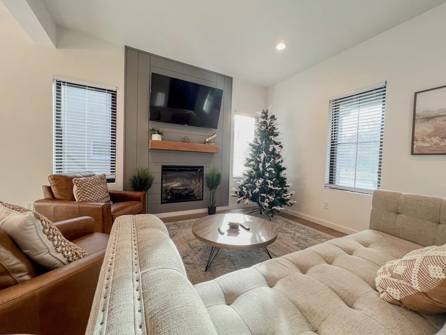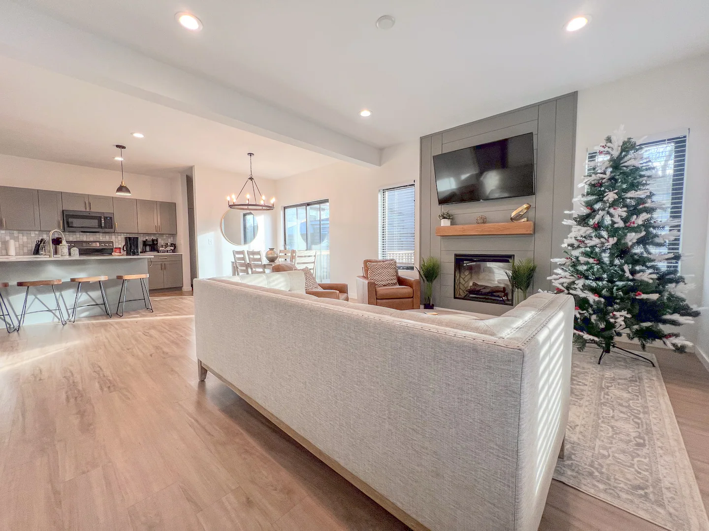 Walk into this beautiful home and you are greeted by an open concept main level. Large family room with electric fireplace, barn wood floating mantel, and a mounted 55″ smart-TV. Seating for the entire family with a large couch and two chairs. The open kitchen with center island has everything you would need if you choose to stay in and make a homemade meal. Large refrigerator, range, above range microwave and dishwasher. Room for 4 guests to eat at the island and a large table with seating for 6 more. Plenty of space for a family or friend gathering. Off the dining area is a sliding glass door with access to the deck. The deck has additional outdoor seating for 4. A sliding barn door off the family room gives access to the main-level laundry area with washer and dryer. A half bath and mudroom with access to the garage round out the main level.